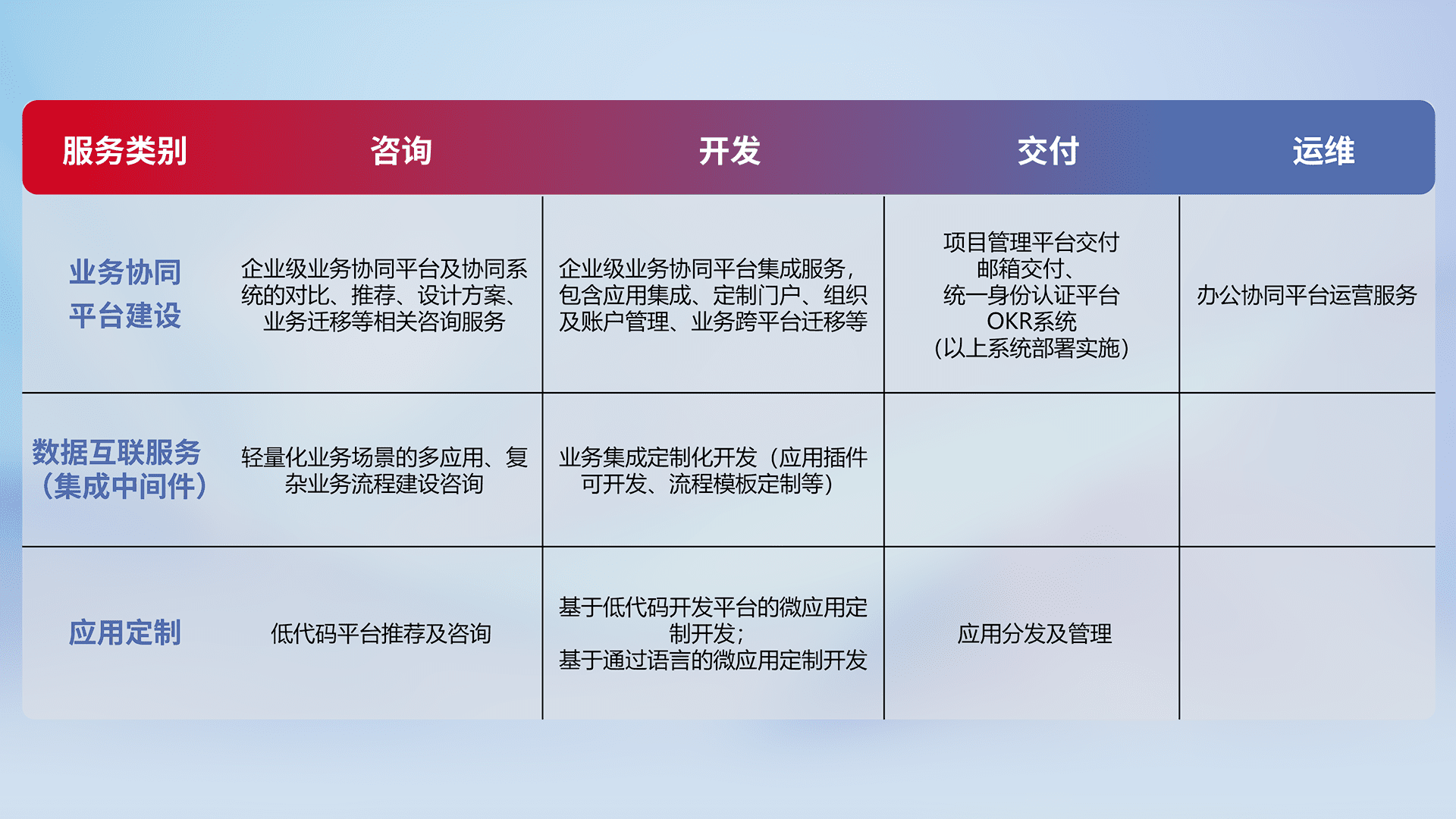 针对钉钉、、企微、、IDaas等平台级产品提供产品的规划、、、、方案、、交付、、、、定制化开发等服务,,实现如统一协同办公、、、智能客户服务、、混合会议管理、、智能数据查询、、、、等业务场景,,,实现数字化转型。。。